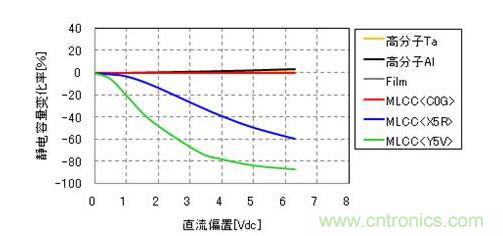 圖1:各種電容器的靜電容量變化率-直流偏置特性(示例)