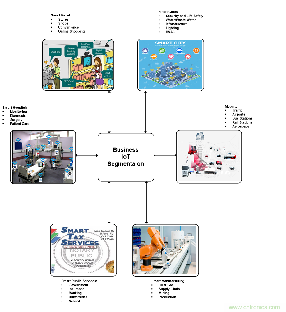 企業(yè)物聯(lián)網(wǎng)的覆蓋范圍巨大,包括零售、醫(yī)療、能源、出行、城市、制造業(yè)和公共服務(wù)。企業(yè)物聯(lián)網(wǎng)細(xì)分市場會改變組織和社區(qū),從而創(chuàng)造一個實現(xiàn)經(jīng)濟增長的新時代。物聯(lián)網(wǎng)通過連接數(shù)據(jù)、人員和機器來提高生產(chǎn)力、生產(chǎn)效率以及日常運營水平。企業(yè)物聯(lián)網(wǎng)也可以作為幫助企業(yè)識別未開發(fā)領(lǐng)域新增長機會的工具。