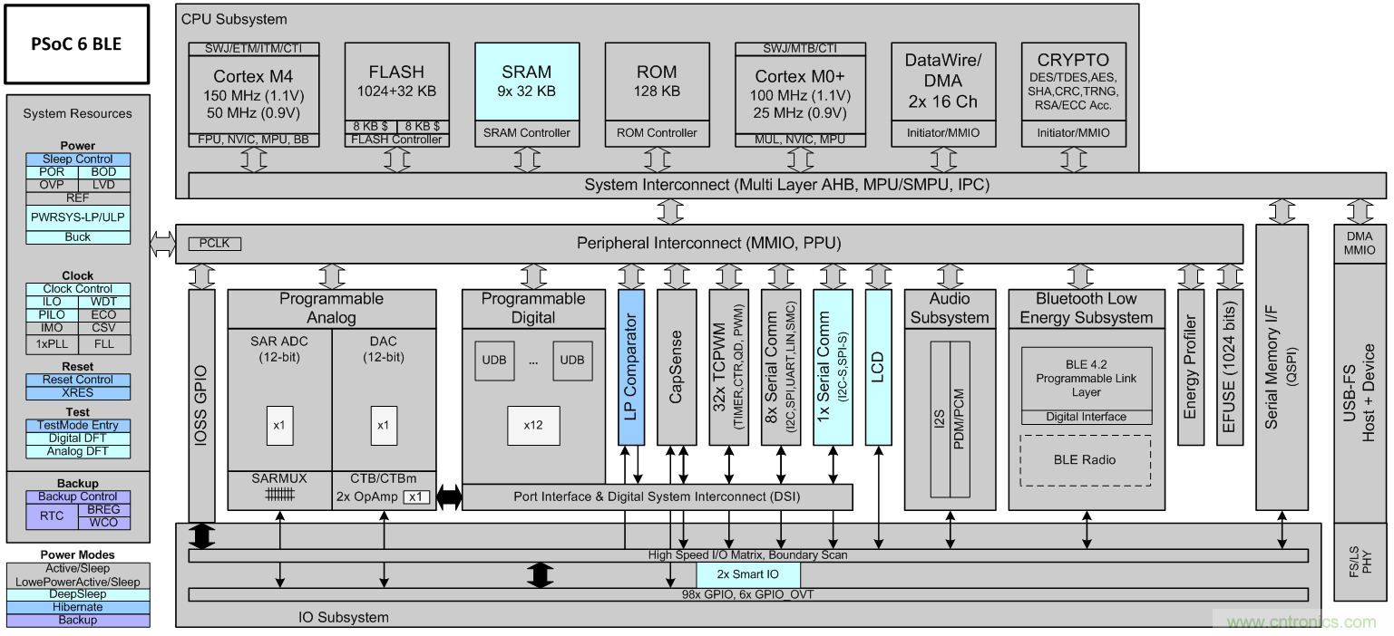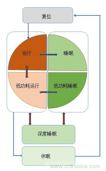 在考慮 MCU 的功耗模式時,超越其基本架構(gòu)十分重要。例如,標(biāo)準(zhǔn) ARM CPU 內(nèi)核支持運行、睡眠和深度睡眠。附加功耗模式通常由特定的 MCU 供應(yīng)商添加。例如,賽普拉斯的 PSoC 6 BLE MCU可執(zhí)行包括,低功耗運行、低功耗睡眠和休眠狀態(tài)在內(nèi)的六種工作功耗模式。