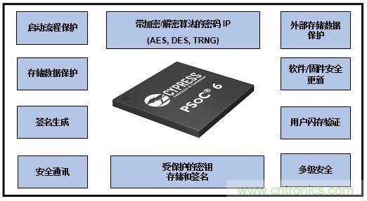 由于許多物聯(lián)網(wǎng)系統(tǒng)會處理用戶的個人數(shù)據(jù),因此確保數(shù)據(jù)的安全尤為重要。代碼存儲器也同樣需要保護,以防止設(shè)備被非法入侵。外部存儲器在安全性方面更加脆弱,因此需要特殊的機制來保護外部存儲的數(shù)據(jù)。為此,MCU 使用各種加密技術(shù)(例如 AES、DES、RSA)來保護數(shù)據(jù)和代碼免受非法訪問。例如,賽普拉斯半導(dǎo)體的 PSoC 6 BLE MCU 提供了一個特殊的串行存儲器接口(SMIF)外設(shè),該外設(shè)支持直接執(zhí)行外部代碼的 XIP(現(xiàn)場執(zhí)行)模式和記錄數(shù)據(jù)的 MMIO(內(nèi)存映射 IO)模式。它使用特殊命令進行控制,比如閃存的編程/擦除、存儲器設(shè)備的睡眠模式輸入等。