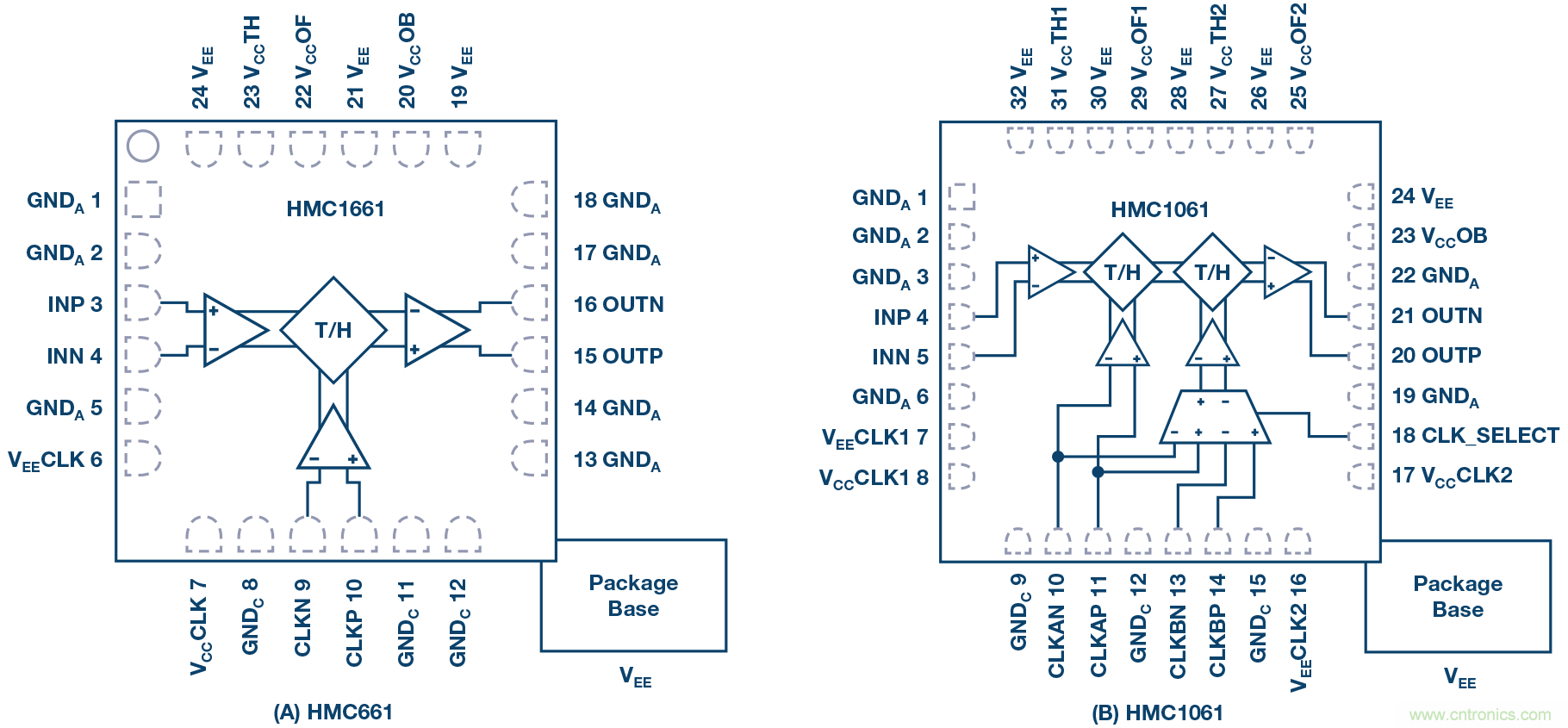 以單級THA HMC661為例,產(chǎn)生的輸出由兩段組成。在輸出波形(正差分時鐘電壓)的采樣模式間隔中,器件成為一個單位增益放大器,在輸入帶寬和輸出放大器帶寬的約束下,它將輸入信號復制到輸出級。在正時鐘到負時鐘躍遷時,器件以非常窄的采樣時間孔徑對輸入信號采樣,并且在負時鐘間隔內(nèi),將輸出保持在一個相對恒定的代表采樣時刻信號的值。配合ADC進行前端采樣時,常常優(yōu)先使用單級器件(ADI 同時法布里了兩級THA 的型號HMC1061),原因是多數(shù)高速ADC已經(jīng)在內(nèi)部集成一個THA,其帶寬通常要小得多。因此,在ADC之前增加一個THA便構(gòu)成一個復合雙級組件(或一個三級組件,如果使用的是雙級HMC1061),THA在轉(zhuǎn)換器前面。采用同等技術和設計時,單級器件的線性度和噪聲性能通常優(yōu)于雙級器件,原因是單級器件的級數(shù)更少。所以,單級器件常常是配合高速ADC進行前端采樣的最佳選擇。