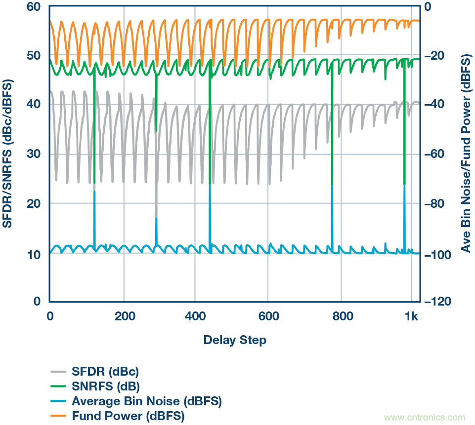 為了獲得最佳延遲設置,將一個信號施加于THA和ADC組合,該信號應在ADC帶寬范圍之外。本例中,我們選擇一個約10 GHz的信號,并施加-6 dBFS的電平(在FFT顯示屏上捕獲)。延遲設置現(xiàn)在以二 進制步進方式掃描,信號的電平和頻率保持恒定。在掃描過程中顯示并捕獲FFT,收集每個延遲設置對應的基波功率和無雜散動態(tài)范圍 (SFDR) 數(shù)值。