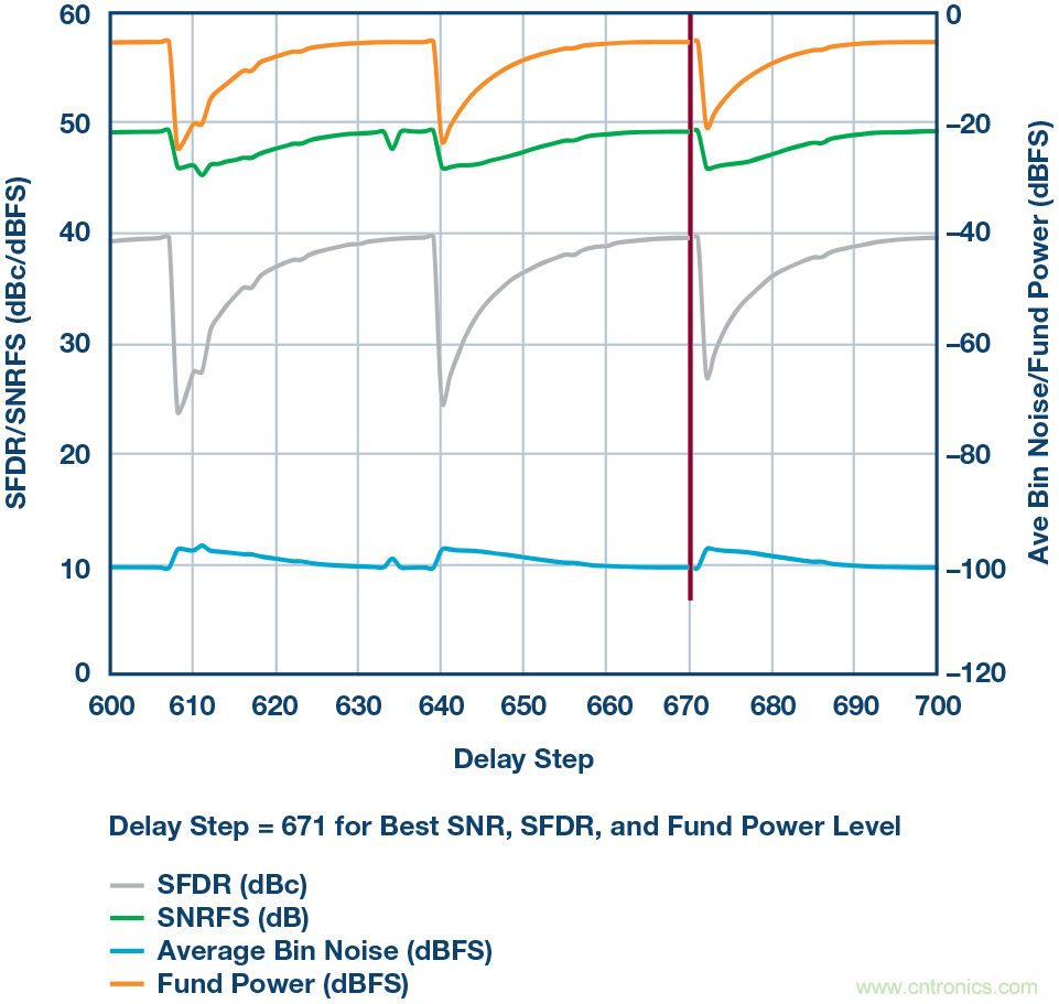結(jié)果如圖3a所示,基波功率、SFDR和SNR將隨所應用的每個設置而變化。如圖所示,當把采樣位置放在更好的地方(THA將樣本送至ADC的過程之中)時,基波功率將處于最高水平,而SFDR應處于最佳性能(即最低)。圖3b為延遲映射掃描的放大視圖,延遲設定點為671,即延遲應該保持固定于此窗口/位置。請記住,延遲映射程序僅對系統(tǒng)的相關采樣頻率有效,如果設計需要不同的采樣時鐘,則需要重新掃描。本例中,采樣頻率為4 GHz,這是該信號鏈中使用的THA器件的最高采樣頻率。
