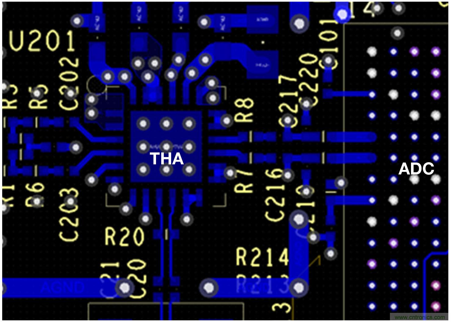 信號通過差分模式連接到THA輸入(我們同時是也提供單端射頻信號輸入的參考設計鏈路),形成單一前端網(wǎng)絡。為了最大限度地減少過孔數(shù)量和總長度,我們在這里特別小心,讓過孔不經(jīng)過這兩條模擬輸入路徑,并且?guī)椭窒呔€連接中的任何線腳。