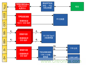 您可將TPD2S300與其他保護(hù)裝置(如TPD1S514(過(guò)壓+沖擊+VBUS的ESD保護(hù))和ESD122 (雙通道低電容ESD保護(hù)))配對(duì),為USB Type-C連接器提供一體式解決方案(圖2)。