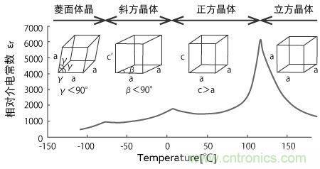 BaTiO3系陶瓷電容器加熱到居里點以上時,結晶構造由正方晶系轉變成立方晶系。冷卻到居里點溫度以下時,結晶構造由立方晶系轉變成正方晶系。(圖2)