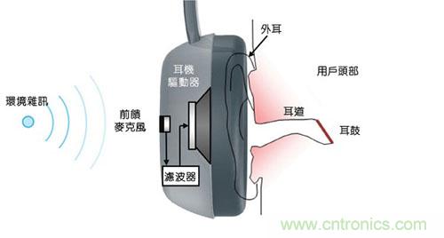 麥克風偵測噪聲并透過濾波電路產(chǎn)生反相訊號,在耳鼓處反相訊號與噪聲訊號抵消,從而降低人耳聽到的噪聲級。這里的濾波電路主要用來補償耳鼓和麥克風處偵測到的噪聲之間差異,另外對于喇叭本身在降噪訊號的響應能力方面也有補償作用。