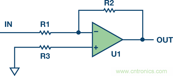 在同相接地輸入端增加一個與輸入電阻R1和反饋電阻R2的并聯組合相等的電阻(圖1中的R3),可以讓阻抗相等。做一些計算可以證明,誤差降至Ioffset × R feedback 。由于I offset 為I bias 的10%到20%,所以這會有助于降低輸出失調誤差。