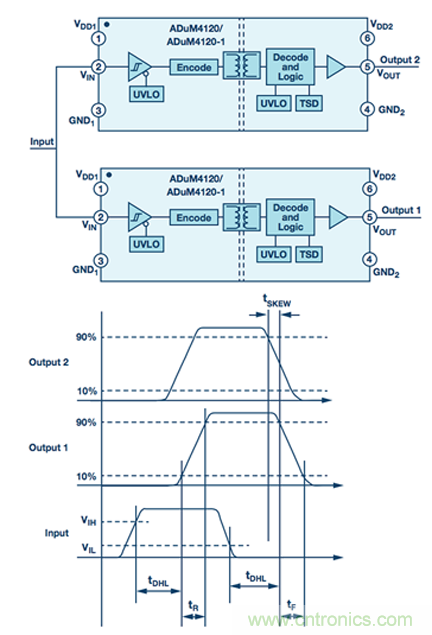 如圖5所示,傳播延遲偏斜被定義為器件間偏差。對于具有多個輸出通道的器件,此規(guī)格的表述方式相同,但被稱為通道間偏斜。傳播延遲偏斜通常不能在控制電路中予以補償。