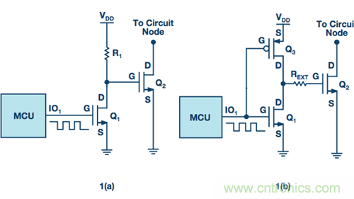 這種設(shè)置的一個問題是Q1導(dǎo)通狀態(tài)下R1的功耗。為了解決此問題,pMOSFET Q3可以作為上拉器件,其以與Q1互補的方式工作,如圖1b所示。PMOS具有較低導(dǎo)通電阻和非常高的關(guān)斷電阻,驅(qū)動電路中的功耗大大降低。為在柵極轉(zhuǎn)換期間控制邊沿速率,Q1的漏極和Q2的柵極之間外加一個小電阻。使用MOSFET的另一個優(yōu)點是其易于在裸片上制作,而制作電阻則相對較難。這種驅(qū)動功率開關(guān)柵極的獨特接口可以單片IC的形式創(chuàng)建,該IC接受邏輯電平電壓并產(chǎn)生更高的功率輸出。此柵極驅(qū)動器IC幾乎總是會有其他內(nèi)部電路來實現(xiàn)更多功能,但它主要用作功率放大器和電平轉(zhuǎn)換器。