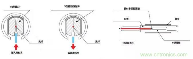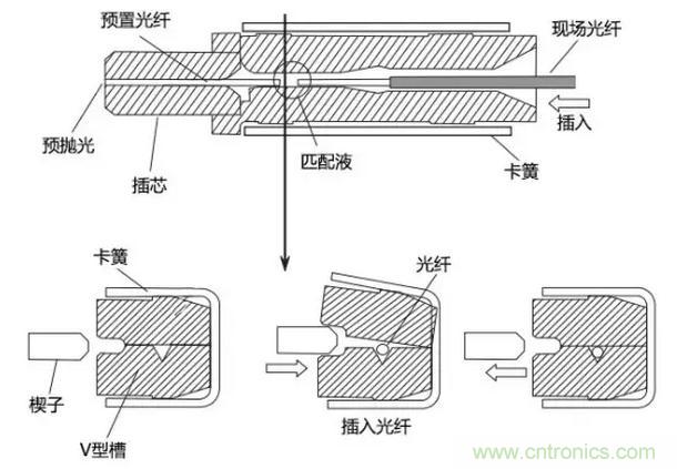 光纖快速連接器/冷接子可分為預(yù)置光纖和非預(yù)置光纖兩大類。預(yù)置光纖快速連接器/冷接子的接續(xù)點(diǎn)在連接器內(nèi)部,并預(yù)置有匹配液;非預(yù)置光纖快速連接器/冷接子的接續(xù)點(diǎn)在連接器表面,不預(yù)置匹配液,直接通過適配器與目標(biāo)光纖對接。非預(yù)置光纖快速連接器/冷接子的工作原理很簡單,這里不做贅述。下面詳細(xì)說明預(yù)置光纖快速連接器/冷接子的原理:如下圖所示,預(yù)置光纖膠接在插芯中,接續(xù)點(diǎn)設(shè)在放有折射率近似纖芯的導(dǎo)光材料-匹配液的V型槽中,從而實(shí)現(xiàn)預(yù)置光纖和目標(biāo)光纖的無縫貼合。