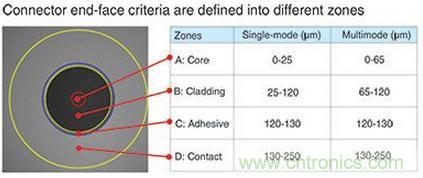 為了正確評估連接器,端面被分成從光纖芯的中心向外輻射不同的區域。由IEC 61300-3-35設定的標準定義了特定區域內可能存在的任何污垢、灰塵或劃痕的特征。詳細可分為MM與SM,UPC與APC,以及帶狀光纖連接器。當然,最嚴格的要求是在A區——光纖的核心(見圖2)。