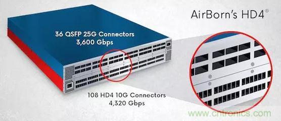 圖2:針對高密度設計的AirBorn 10GHD4®連接器可在同一托架系統內提供比25G QSFP連接器更高的吞吐量,從而實現組件和能源成本節省。