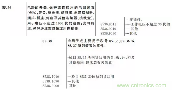 首先看看注釋和品目8536、品目8538