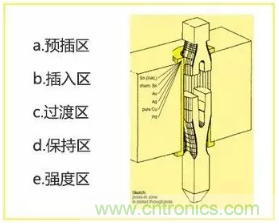 業(yè)界為 Press-fit 端子設(shè)計(jì)了各種形態(tài),這些形態(tài)各有優(yōu)缺點(diǎn)。其中,魚眼孔端子是應(yīng)用最為廣泛的 Press-fit 端子結(jié)構(gòu)。通常一個(gè)典型魚眼孔端子分 5 個(gè)區(qū)域(如上圖所示)。