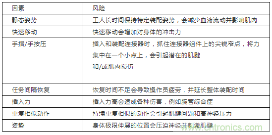 了解并記錄操作員執(zhí)行的任務(wù)順序,有助于識別相關(guān)人機工程學風險。例如,連接器操作員需要手腕和手指用力才能將插座連接器和插頭連接器壓在一起。對鎖扣連接器的高頻操作可能引起手腕綜合癥(CTS)。