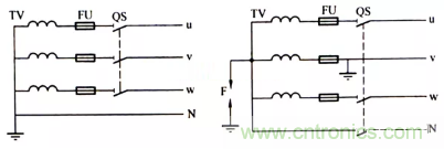圖6:電壓互感器二次側的接地方式 說明:圖6(a)中性點接地;圖6(b)v相接地