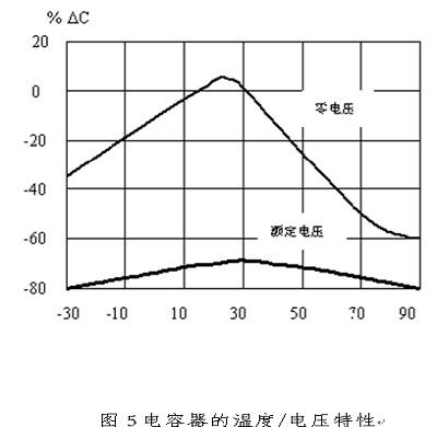 從圖中可以看到,COG電容器的容量幾乎隨溫度沒有變化,X7R電容器的容量在額定工作溫度范圍變化12%以下,Y5V電容器的容量在額定工作溫度范圍內變化70%以上。這些特性是必須注意的,否則會出現濾波器在高溫或低溫時性能變化而導致設備產生電磁兼容問題。