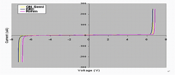 當對以上器件的DC性能進行比較的時候,結果看起來似乎是相同的(參見圖2所示曲線)。此外,它們都聲稱符合IEC61000-4-2第4級標準,這就意味著它們將都經受住高達8kV接觸電壓的ESD沖擊。