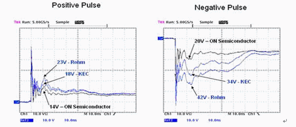 從圖3所示的圖上可見,顯然,與兩個競爭對手的器件(藍色波形)相比較,安森美半導體保護解決方案(黑色波形)可提供更低的ESD脈沖箝位電壓。與KEC的18V和Rohm的23V相比較,安森美的器件將正脈沖箝位在14V。而在負脈沖期間,這三個器件之間箝位電壓的差異更加明顯。安森美、競爭對手2和競爭對手1的器件對負脈沖的箝位電壓分別是20V、34V和42V。在負ESD期間這三種器件之間有明顯的區別,競爭對手2的器件的箝位電壓比安森美的器件高70%,而競爭對手1的器件的箝位電壓則是安森美器件的兩倍之多。通過競爭對手的保護器件后的剩余負脈沖電壓對那些更容易受到ESD破壞的新IC設計有潛在的危險。然而,安森美的器件卻能在負脈沖和正脈沖兩個方向上保持低的箝位電壓,從而將遭受正/負ESD脈沖的破壞風險都保持在最低水平。