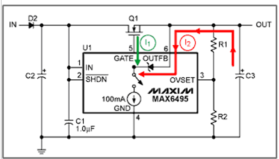 MAX6495–MAX6499/MAX6397/MAX6398通過內(nèi)部100mA的電流源(見圖4)連接到GATE輸出,以對(duì)柵極電容和輸出電容放電。電流源先對(duì)GATE放電(電流I1,綠色箭頭),直到GATE的電壓等于OUTFB電壓,然后斷開FET,電流源繼續(xù)降低GATE電壓,最后,直到內(nèi)部的箝位二極管變?yōu)檎蚱茫瑢?duì)輸出電容放電(電流I2,紅色箭頭)。