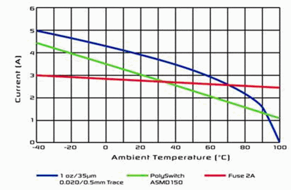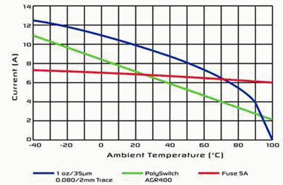 必須注意的是,在整個溫度范圍內,PPTC器件的觸發(fā)電流是如何跟隨印制線上的電流。在這兩種情況中,即使可以使用熔斷器,在汽車高于有用的標準溫度下,尺寸最接近的熔斷器也不能保護它。
