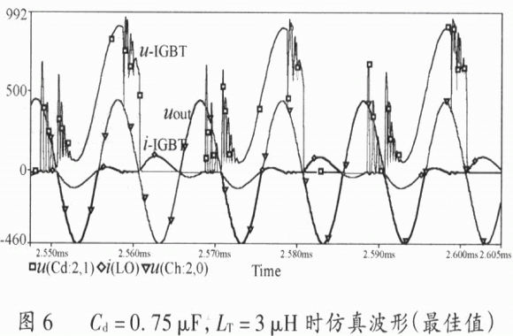 圖6是LT/Cd=4,Cd=0.75μF,LT=3μH時的仿真波形,通過與圖4和圖5的對比可以看出,此時參數選擇最為合適。