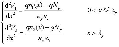 本文采用電子分布曲線擬合近似,設多晶硅/二氧化硅界面處為0=x點,向上為正,峰值處的點的坐標為,分別用以下分布來近似上升和下降階段的載流子分布: