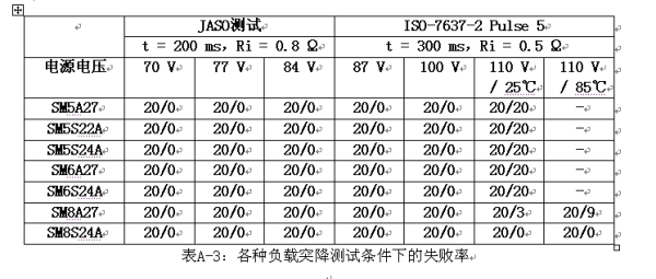 表A-3所示為Vishay的負載突降TVS在各種負載突降測試條件下的失敗率。SM8S24A是ISO-7637-2 Pulse 5測試最大額定值條件下最強大的器件。