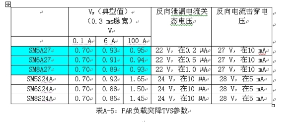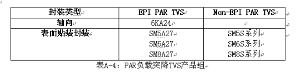 Vishay有兩種類型的汽車電子初級保護負載突降TVS:EPI PARTVS和Non-EPI PARTVS。PAR TVS的產品組列在表A-4當中。
