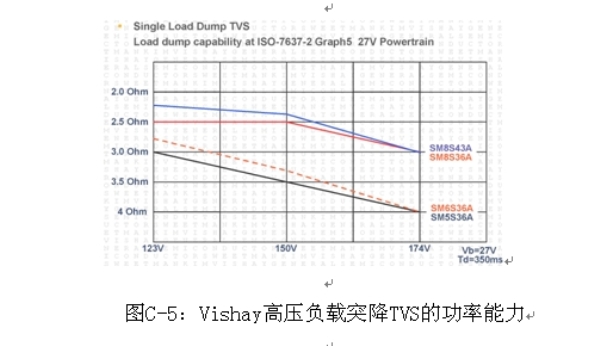 圖C-4考慮到了汽車電子中半導體的最大輸入電壓的約定是75 V的需求,某些Vishay負載突降系列可以滿足42 V電源系統的要求。