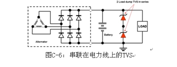 圖C-6是兩個串聯TVS的典型應用,圖C-7是各種線路電阻和電壓條件下兩個串聯的負載突降TVS的功率能力。