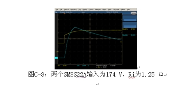 至少,兩個串聯的SM5S22A箝位負載突降電壓輸入為174 V,線路電阻為2 Ω,而SM6S22A或SM8S22A具有更低的箝位電壓和更低的線路電阻。