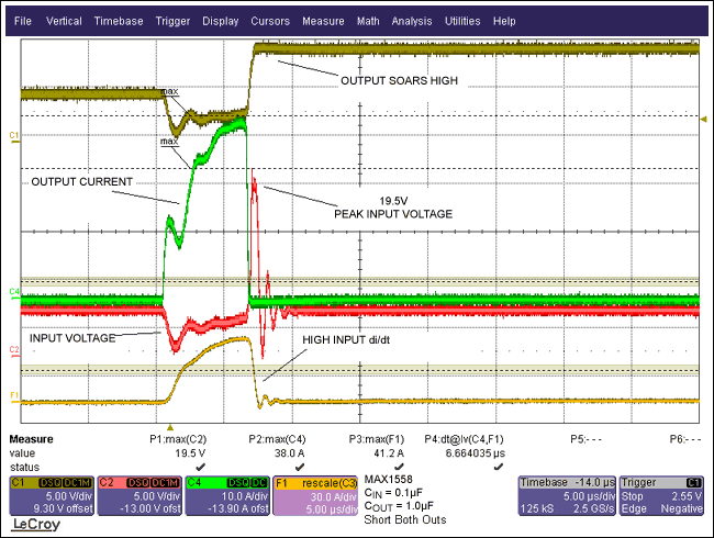 圖2.波形顯示了具有10µFCBYPASS情況下的短路響應,從VIN波形可以看出:由于電流變化使得輸入電壓上沖到了8.6V。