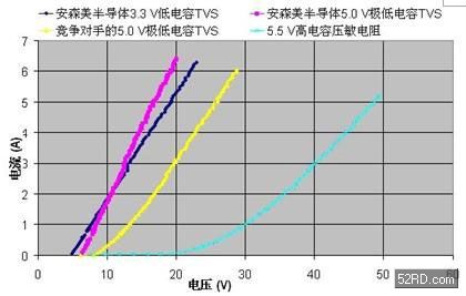 結合ESD脈沖測試和TLP測試,我們可以得出結論,在不同ESD保護元件中,TVS元件,特別是安森美半導體的TVS元件的大電流導電率極佳,且在重復應力條件下仍能維持優異性能,不存在壓敏電阻或聚合物那樣的使用增多后會出現性能下降的問題;至于其在電容方面的不足,也隨著新的低電容設計的出現,而消除了早前的大電容問題。