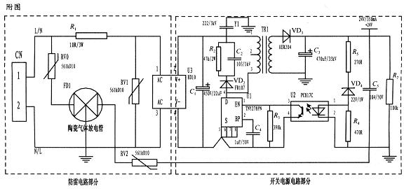陶瓷氣體放電管的通流容量根據(jù)要求的通流容量選擇,電路采用3RM470L-7.5-L,通流量為5000A。線繞電阻R1起限流分壓作用;貼片整流模塊為開關(guān)電源電路前端整流作用,C1為高壓濾波電容,Y1為去耦電容,電阻R2和電容C2及VD2組成開關(guān)電源芯片MOS管的吸收鉗位電路,保護(hù)芯片,開關(guān)電源芯片采用PI公司的TNY27系列,TR1為高頻變壓器,VD3、C3構(gòu)成高頻變壓器次級濾波,U2、VD4、R3、R4、R5構(gòu)成開關(guān)電源電路的反饋電路,可將變壓器次級輸出電壓穩(wěn)定在設(shè)計值,此防雷抗浪涌電路在實(shí)際使用中取得了較好的效果。