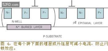 你可使用CMOS布局技術來防止閂鎖效應,因為CMOS布局技術可監(jiān)控ESD瞬變會進入器件的各部位:器件的電源引腳、輸入引腳和輸出引腳。你應降低晶體管(PNP和NPN)的增益,并提高閂鎖效應的閾值,方法是加大器件結構中P溝道Tub與P溝道漏極之間的間隔。在電源和p-tub上連接p+和n+保護環(huán)也可以降低晶體管增益,提高閂鎖效應的閾值(圖3)。防止閂鎖效應的其他工藝技術有:提高阱深度以減少寄生晶體管的增益;采用絕緣襯底(如藍寶石硅)以降低tub和襯底中的電流,;在每個阱下面采用埋層或外延層(圖4)。