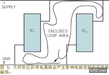 你如果使用布局和布線都很好的電路板,就可以顯著減少ESD問題的發(fā)生率(見附文《實現(xiàn)ESD故障最小化的電路設計原則》)。每一電路都因為有不同類型的元器件和電流而存在有靜電通量線和磁通量線。如果電路板布線圍住很大的環(huán)形區(qū),則導電通路就會圍住較大的磁通量,由于環(huán)路起天線的作用,較大的磁通量又會在環(huán)路中感應產(chǎn)生電流。這種環(huán)路電流會產(chǎn)生影響電路中元器件的干擾電磁場。減小環(huán)路區(qū)的方法是使電源線和地線盡量靠近在一起。圖5示出了典型的電源線和地線形成的環(huán)路區(qū)。