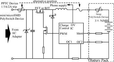 圖1是一個典型的電池充電電路。其中,交流電通過AC/DC電源適配器轉變?yōu)楹线m電壓對電池組進行充電。PPTC元件與過壓保護元件協(xié)調作用共同完成下列工作: