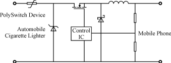 圖3顯示一個典型的CLA電路圖。圖3中是一個PolySwich自復元件和一個瞬時限壓(TVS)二極管提供輸入保護。IC用于控制DC/DC降壓轉換器,由PPTC獨用或與TVS相結合的保護措施可以防止以下4種故障造成的損壞。