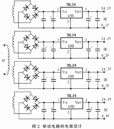 驅動電路需要4路相互隔離的直流電源為4路IGBT驅動電路供電,用220V/22V變壓器對4路交流電源分別整流,用電容器和78L24型電壓調整器穩壓后輸出4路24V直流電壓,如圖2所示。