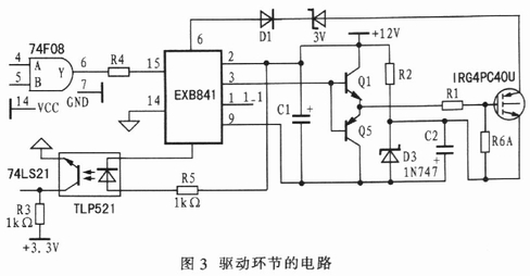 EXB841的6引腳連接的二極管可檢測IGBT的飽和壓降,用來完成過流保護功能,4引腳的過流保護信號延時10μs輸出。當IGBT有過流時,若UCE大于7.5V,內部過流保護電路開始動作,軟關斷IG-BT。通常在IGBT通過額定電流時UCE為3.5V,當UCE=7.5V時,IGBT有過流,其值約為額定電流的3~5倍,但是由于沒有達到保護的閾值,保護電路不起作用。如果長時間工作在這種狀態,則會導致IGBT損壞。為了可靠地保護IGBT,應該降低過流保護閾值,可以在D1與IGBT的集電極間反串一個穩壓管,或多串幾個與D1同規格的快速恢復二極管。如圖3通過反串一個IN4728型3.3V穩壓管使保護閾值降為4.2V。當檢測到IGBT過流后,5引腳變為低電平,TPL521型光耦輸出低電平,通過與門封鎖控制信號輸入,同時使4輸入與非門輸出低電平,觸發功率驅動保護中斷,完成相應的保護處理。