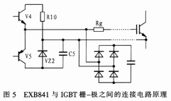 圖5所示為EXB841與IGBT柵-射極之間的連接電路原理圖。當驅動電路中的V4導通時,IGBT處于正常導通狀態,當V5導通時,IGBT柵-射極之間通過穩壓管VZ2提供一個-5V電壓加在其兩端,使IGBT關斷,此時V5處于臨界導通狀態,穩壓管VZ2處于反向偏置狀態。但由于集-柵極之間分布電容的影響,集-柵極之間的du/dt增大時,其通過分布電容形成的電流經過,所以,要克服集-柵極之間的du/dt,確保穩壓管不過壓,避免IGBT誤導通??朔u/dt的方法有二種:一是驅動電路輸出與IGBT柵-射極之間的連線采用雙絞屏蔽電纜,屏蔽層接地,二是采用快速吸收電路吸收過電壓。