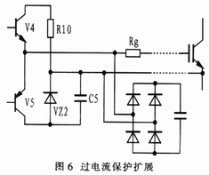 在實際應用中,僅靠EXB841的6引腳檢測IG-BT集電極電壓來實現過流保護并不足以有效地保護IGBT,因此有必要在主電路中加接霍爾電流傳感器來檢測電路中的過流,如圖6所示。過流發生后,檢測電路檢測到電流,延時8μs后信號還存在的話。封鎖驅動信號以關斷IGBT。在圖中,霍爾電流傳感器如果在主電路中檢測到過流信號,其中的PNP三極管將導通,同時,NPN三極管被截止,EXB841的6腳被懸空;當沒有過流信號時,PNP三極管不導通,NPN三極管導通,此時電路等效于擴展前的電路。