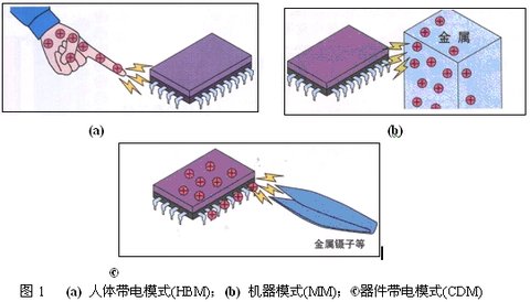 器件的靜電破壞模式大致分為以下3種:人體帶電模式(HBM)、機器模式(MM)、器件帶電模式(CDM)。