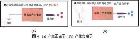 ⑵ 電暈放電是指:2個導體之間產生局部高電壓時,因空氣絕緣遭到破壞而產生的伴有藍紫色輝光的放電現象。電暈放電式除靜電器會對放電針施加高電壓,從而引起電暈放電。由于電暈放電的緣故,放電針附近的空氣發生電離,產生帶電離子。圖4(a)所示為向放電針施加帶正電的高電壓后產生正離子過程。圖4(b)所示為向放電針施加帶負電的高電壓后,產生負離子過程。