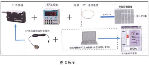 從圖8可知,通過電腦進行設定的EP監視器連接是由外部控制裝置與電腦及其組件構成。而組件必需是EP傳感器1臺(如DTY-EPS型)與EP監視器1臺(如DTY-EPU)及電源SW•通信電纜線.及EP傳感器用通信電纜線。