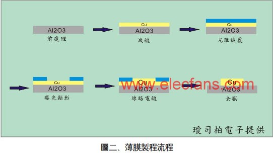 從傳統的PCB(FR4)板,到現在的陶瓷基板,LED不斷往更高功率的需求發展,現階段陶瓷基板之金屬線路多以厚膜技術成型,然而厚膜印刷的對位精準度使得其無法跟上LED封裝技術之進步,其主要因素為在更高功率LED元件的散熱設計中,使用了共晶以及覆晶兩種封裝技術,這些技術的導入不但可以使用高發光效率的LED芯片,更可以大幅降低其熱阻值并且讓接合度更加完善,讓整體運作的功率都相對的提昇。但是這兩種接合方式的應用都需要擁有精確金屬線路設計的基礎,因此以曝光微影為對位方式的薄膜型陶瓷散熱基板就變成為精準線路設計主流。