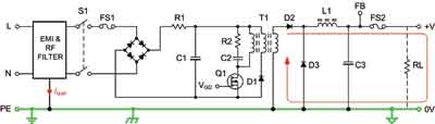 本地電路直流接地與電源接地參考電壓間的鏈路通常由負責將線路電壓轉換成所需直流輸出的電源提供。圖1顯示了一款低成本開關模式電源的簡化結構圖,該開關模式電源通常用于個人電腦、激光打印機和其他設備。SMPS輸出的直流接地通過SMPSChassis以電源的保護性接地(PE)導線為參考。因此,該直接鏈路起了一個感應導線的作用,從而將PE電壓變成了本地直流接地電壓。