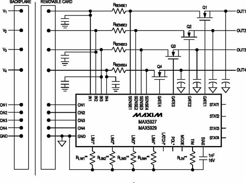 Maxim公司推出了一系列電源熱插拔控制器,適應于各種背板電源的要求。MAX5927/5929是針對低壓電源系統的+1V到13.2V的四通道熱插拔控制器。在電路板熱插拔時,MAX5927/5929控制輸出電壓緩慢升高,同時限制輸入電流小于預設值,避免瞬態大電流沖擊,保證了系統的安全性和穩定性。圖1是典型應用電路圖,圖2是熱插拔時的啟動電壓、電流波形。可以看出,MOSFET的柵極電壓受MAX5927/5929的控制,按照固定斜率上升,逐漸打開MOSFET,輸出到電路板的電壓也基本同步地按斜率上升,瞬態電流則始終被控制在門限值以內,避免了大的沖擊電流的出現。啟動時間和電流限值都可以簡單地通過一個外部電阻來設定,為設計工程師提供了極大的靈活性。